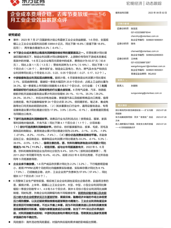 【东方证券】【20230802】1-6月工业企业效益数据点评:企业成本费用企稳,去库节奏放缓-4页 行业研究