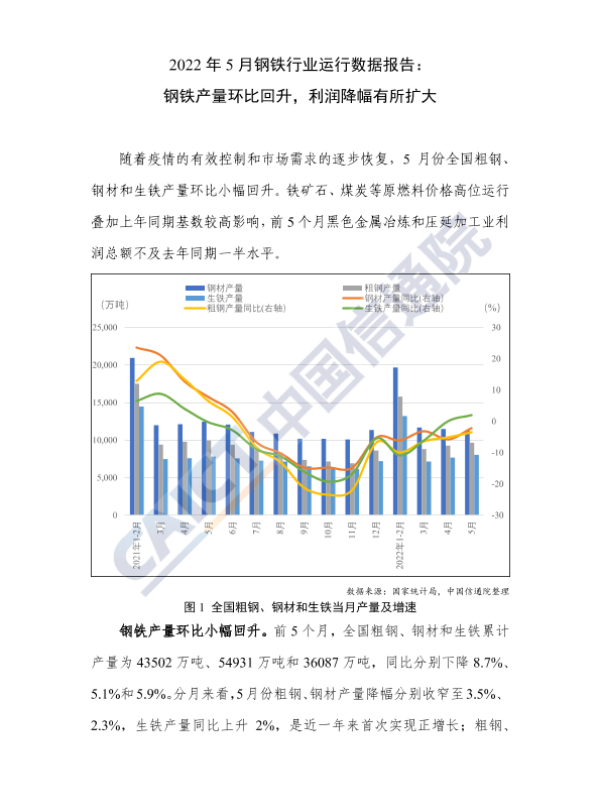 【中国信通院】【20220701】2022年5月钢铁行业运行数据报告:钢铁产量环比回升,利润降幅有所扩大-4页 行业研究