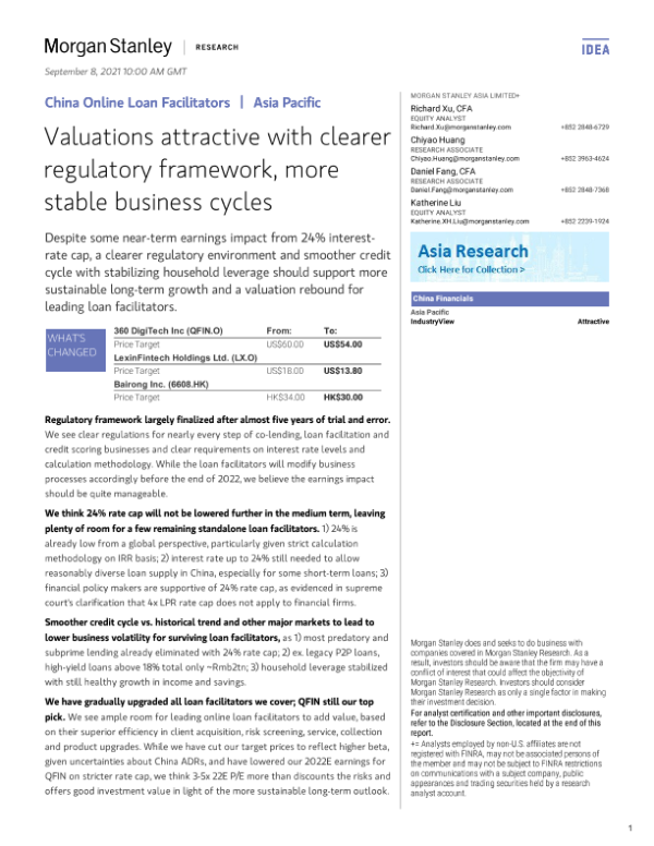 【Morgan Stanley】【20210908】中国网贷服务商:更清晰的监管框架、更稳定的商业周期使估值更具吸引力-43页 行业研究
