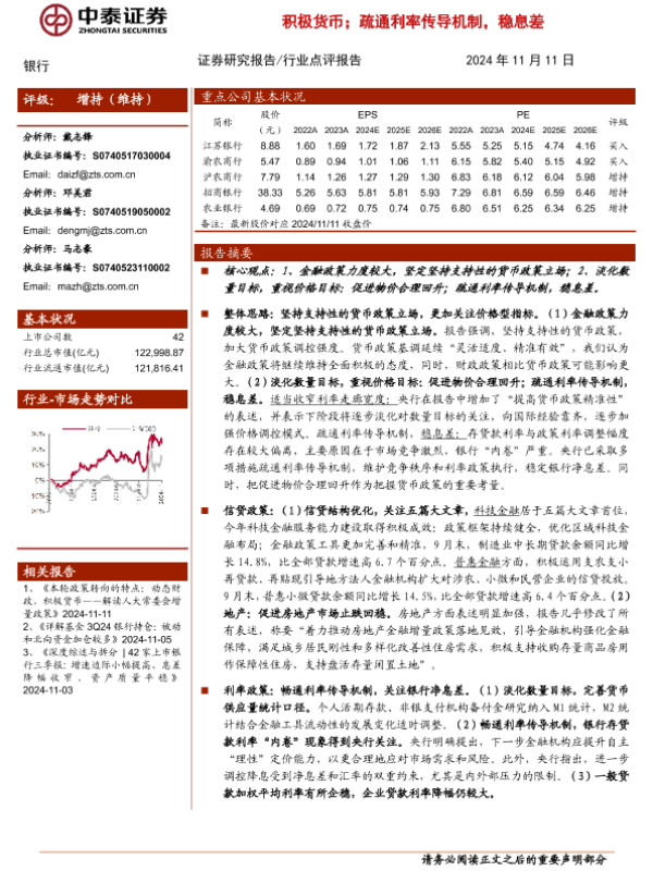 【中泰证券】【20241111】银行业3Q24货币政策执行报告点评:积极货币;疏通利率传导机制,稳息差-8页 行业研究
