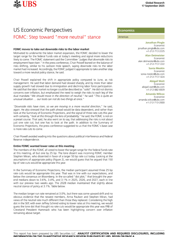 【UBS】【202309】US Economic Perspectives FOMC Step toward " more neutral" stance-7页 证券期货研究报告