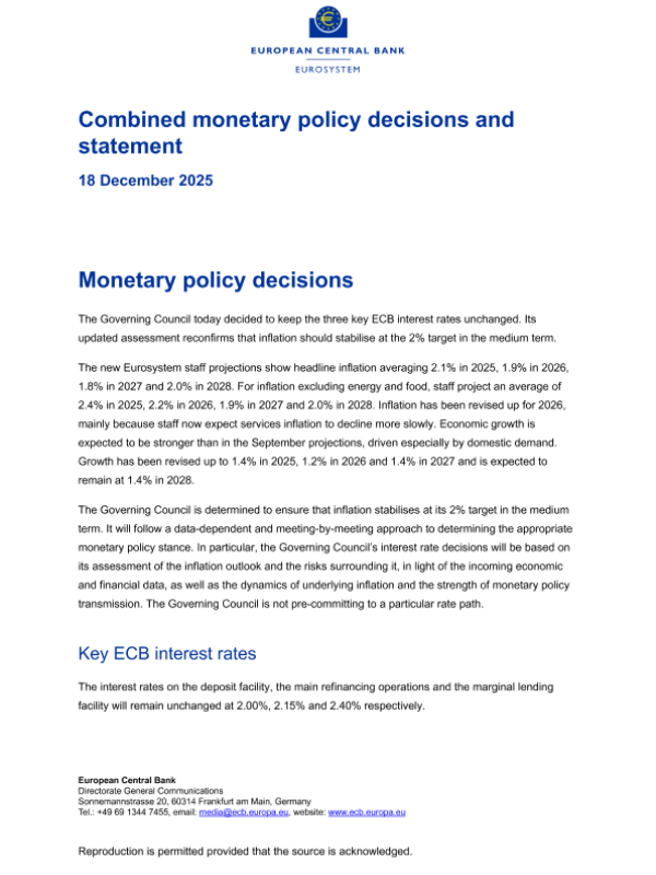 【European Central Bank】【202512】Combined monetary policy decisions and statement-6页 政策文件
