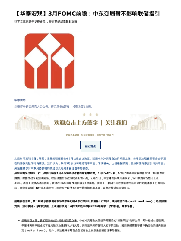 【华泰证券】【202603】3月FOMC前瞻:中东变局暂不影响联储指引-3页 证券期货研究报告