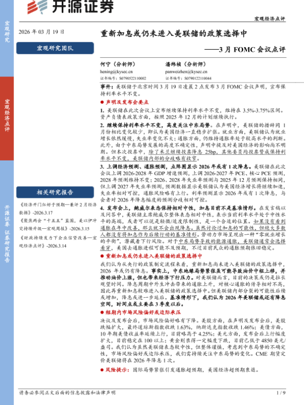【开源证券】【202603】重新加息或仍未进入美联储的政策选择中——3月 FOMC会议点评-9页 证券期货研究报告