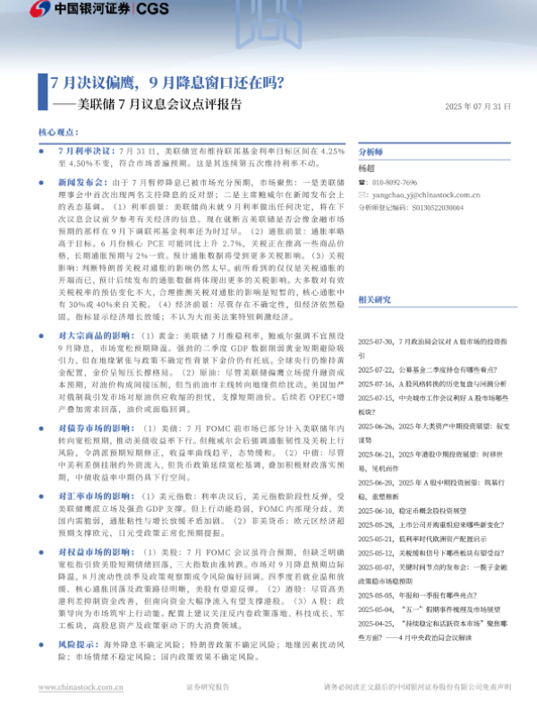 【中国银河证券|CGS】【202507】美联储7月议息会议点评报告:7月决议偏鹰,9月降息窗口还在吗?-10页 证券期货研究报告
