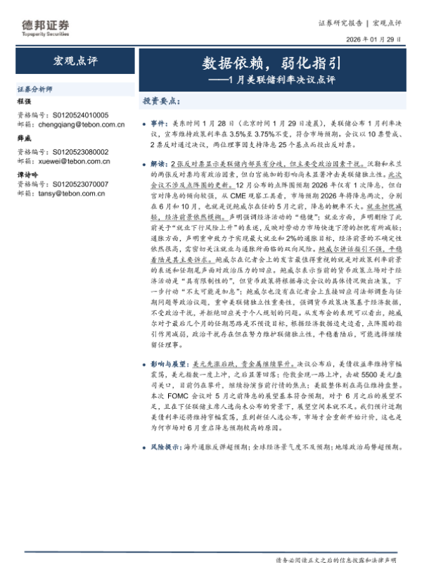 【德邦证券】【202401】数据依赖,弱化指引——1月美联储利率决议点评-5页 证券期货研究报告