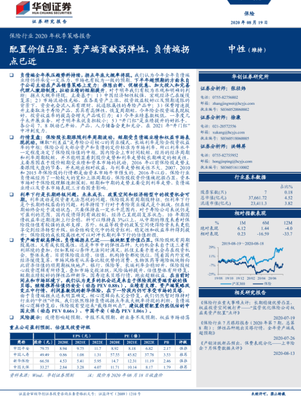 【华创证券】【20200819】2020年秋季策略报告:配置价值凸显:资产端贡献高弹性,负债端拐点已近-20页 行业研究