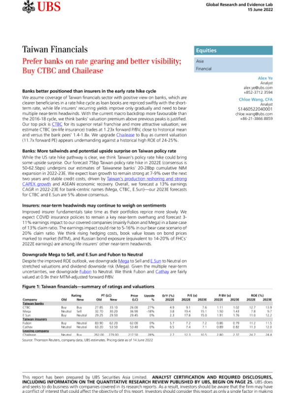 【瑞银】【20220615】瑞银-亚太地区金融行业-台湾地区金融业:偏好利率杠杆和较好能见度的银行;买入CTBC和Chailease-32页 行业研究