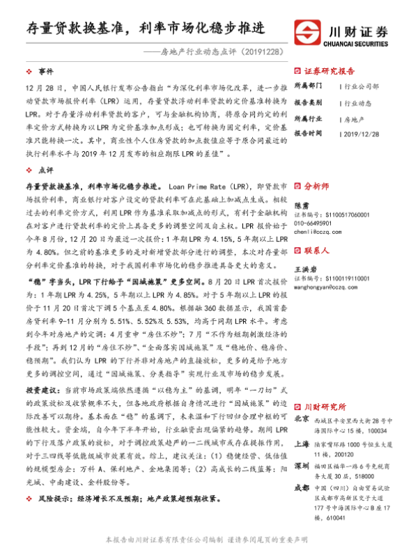 【川财证券】【20191228】房地产行业点评:存量贷款换基准,利率市场化稳步推进-2页 证券期货研究报告