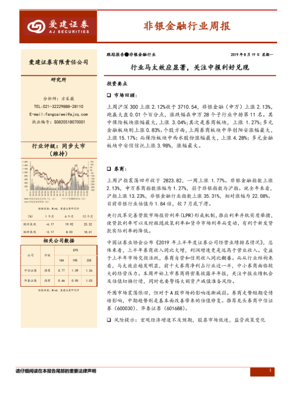 【爱建证券】【20190819】非银金融行业周报:行业马太效应显著,关注中报利好兑现-11页 行业研究