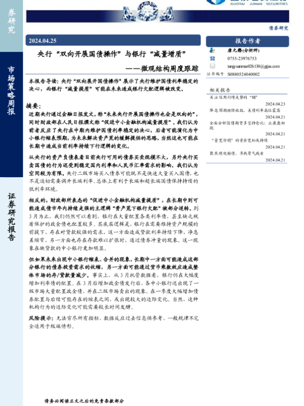 【国泰君安证券】【20240425】微观结构跟踪:央行“双向开展国债操作”与银行“减量增质”-13页 行业研究