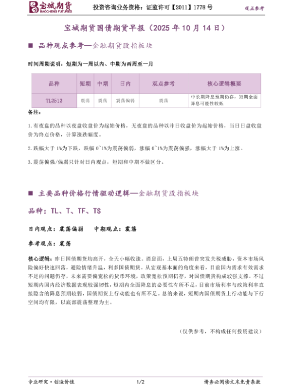 【宝城期货】【202510】宝城期货国债期货早报(2025年 10月 14日)-2页 证券期货研究报告