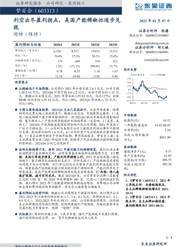 【东吴证券】【20220207】梦百合-603313.SH-利空出尽盈利拐点_美国产能稀缺性逐步兑现-3页 行业研究