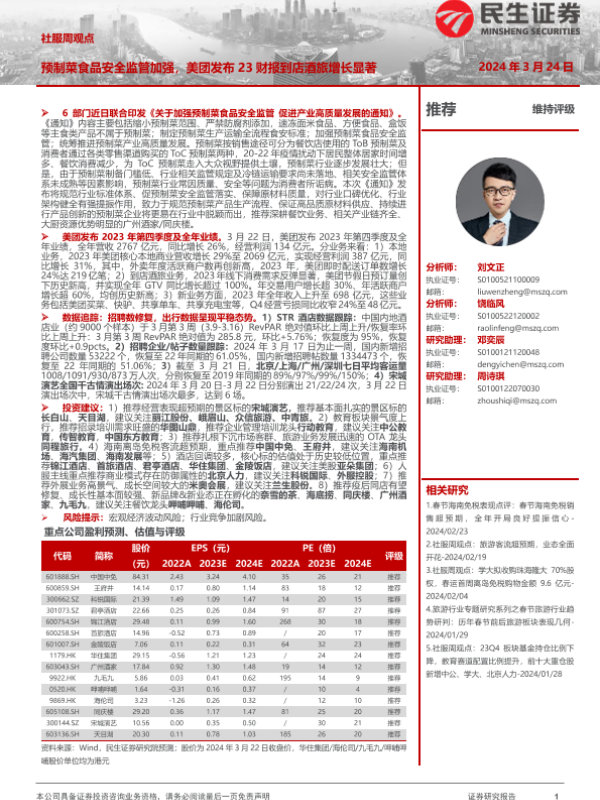 【民生证券】【20240324】社服周观点:预制菜食品安全监管加强,美团发布23财报到店酒旅增长显著-26页 行业研究