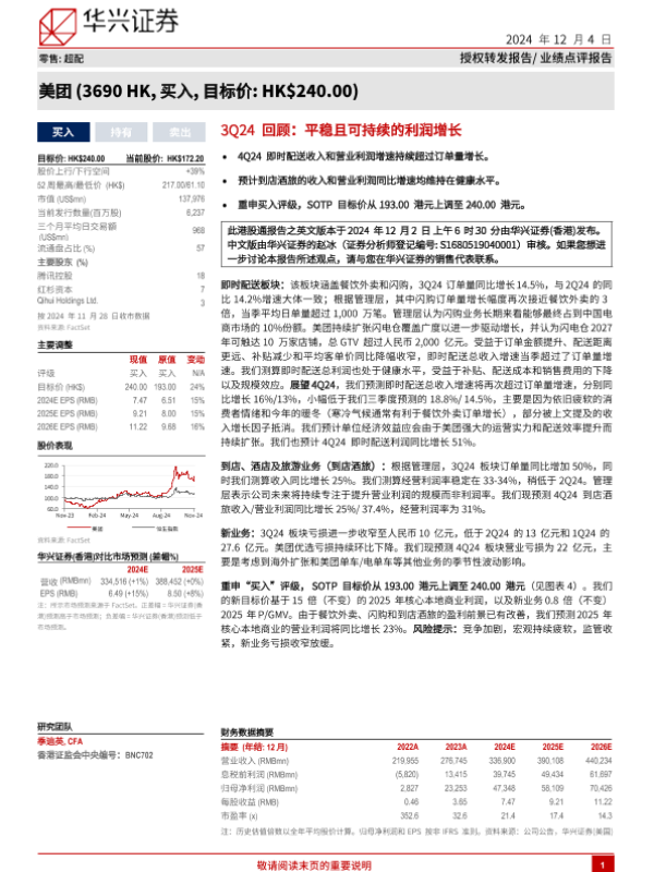 【华兴证券】【20241204】美团(3690.HK)3Q24回顾:平稳且可持续的利润增长-11页 行业研究