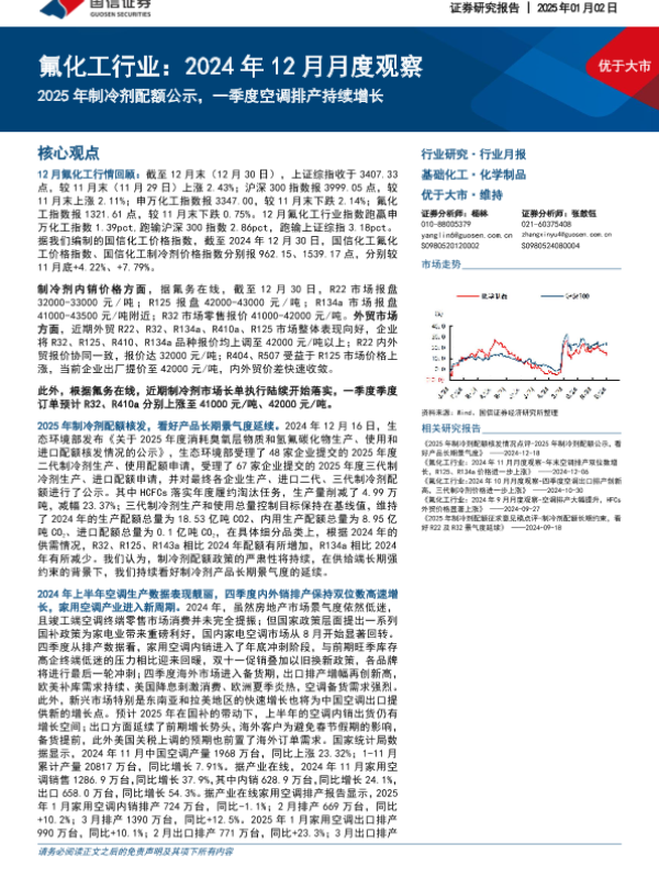 【国信证券】【20250102】氟化工行业:2024年12月月度观察:2025年制冷剂配额公示,一季度空调排产持续增长-26页 行业研究