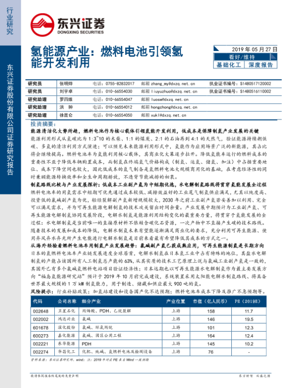 【东兴证券】【20190527】基础化工:氢能源产业:燃料电池引领氢能开发利用-26页 行业研究