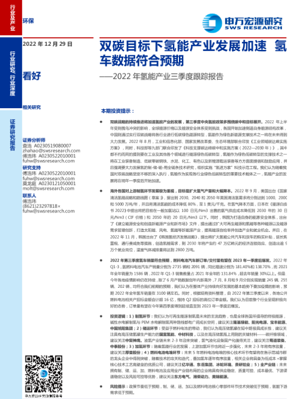 【申万宏源】【20221229】环保行业2022年氢能产业三季度跟踪报告:双碳目标下氢能产业发展加速,氢车数据符合预期-51页 行业研究