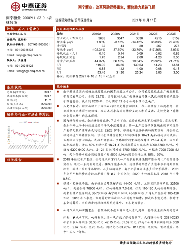 【中泰证券】【20211017】南宁糖业:改革风劲涅槃重生,糖价助力亟待飞扬-19页 行业研究