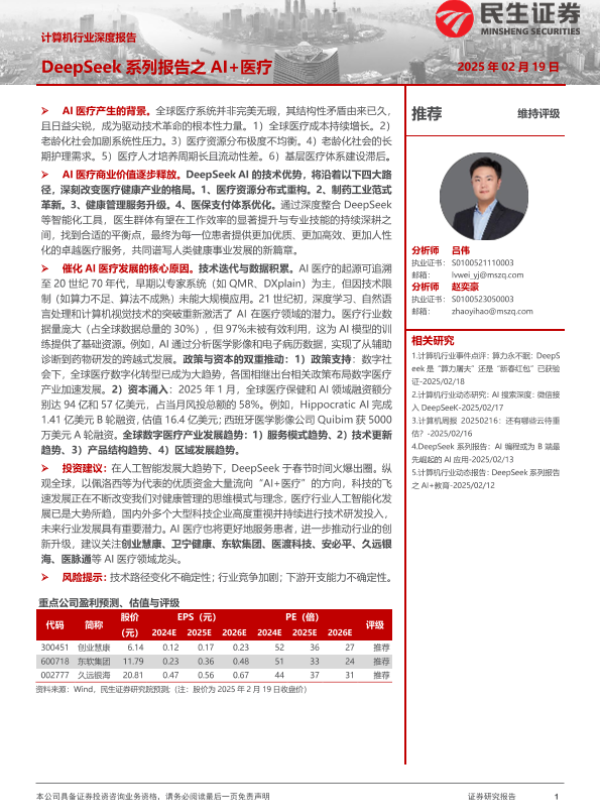 【民生证券】【20250219】计算机行业深度报告:DeepSeek系列报告之AI+医疗-39页 行业研究