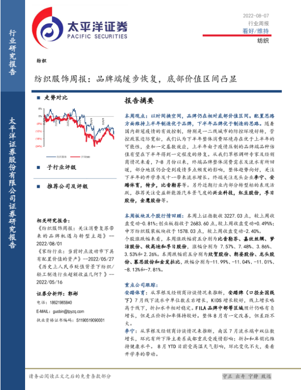【太平洋证券】【20220807】20220807-太平洋-纺织服饰周报:品牌端缓步恢复,底部价值区间凸显-25页 行业研究
