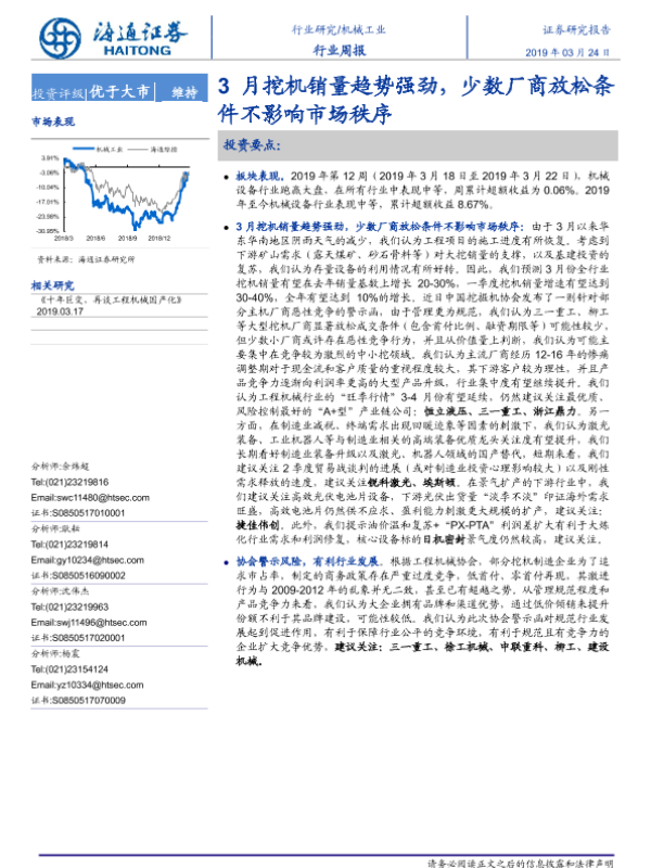 【海通证券】【20190324】20190324-海通证券-机械工业行业周报:3月挖机销量趋势强劲,少数厂商放松条件不影响市场秩序-10页 行业研究