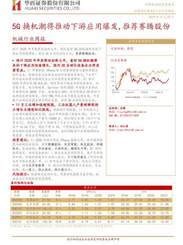 【华西证券】【20191222】5G换机潮将推动下游应用爆发,推荐赛腾股份-3页 行业研究
