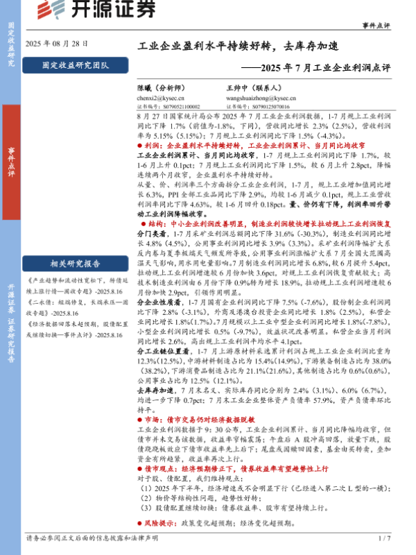 【开源证券】【20250828】工业企业盈利水平持续好转-去库存加速-7页 证券期货研究报告
