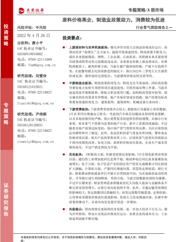 【东莞证券】【20220426】行业景气跟踪报告之一:原料价格高企,制造业政策助力,消费较为低迷-36页 行业研究