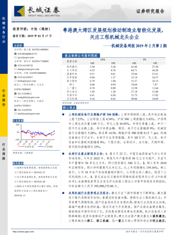 【长城证券】【20190217】机械设备周报2019年2月第2期:粤港澳大湾区发展规划推动制造业智能化发展,关注工程机械龙头企业-11页 行业研究