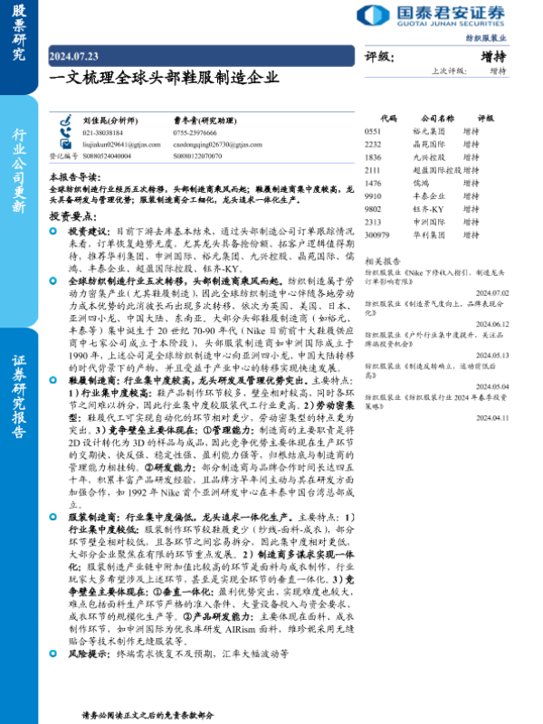 【国泰君安证券】【20240723】纺织服装行业:一文梳理全球头部鞋服制造企业-48页 行业研究