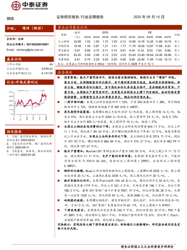 【中泰证券】【202509】钢铁行业:铁水产量明显回升,制造业需求维持韧性-16页 证券期货研究报告