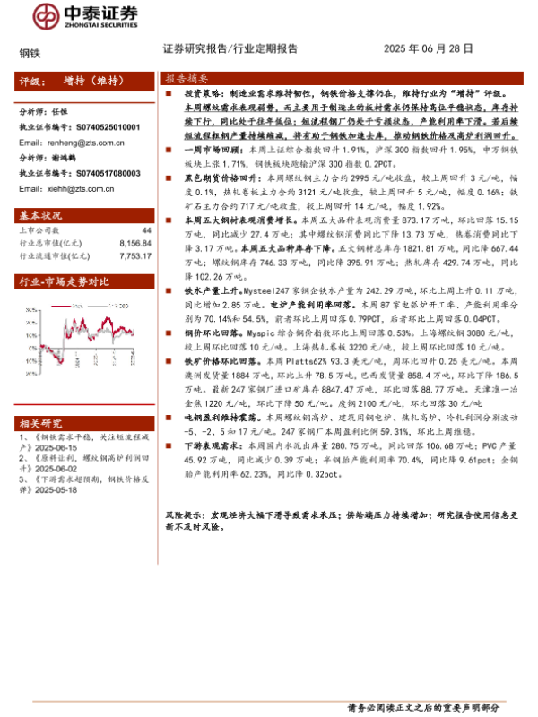 【中泰证券】【20250628】钢铁行业:制造业需求维持韧性,钢铁价格支撑仍在-17页 证券期货研究报告