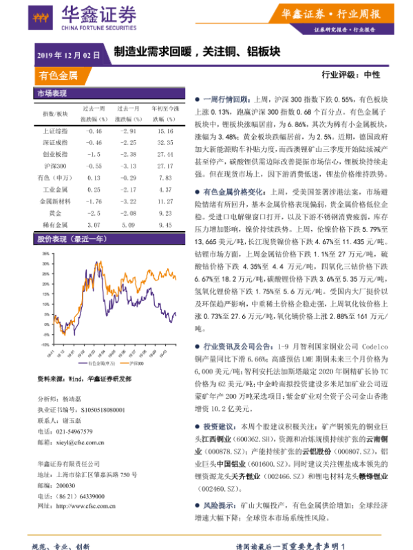 【华鑫证券】【20191202】20191202-华鑫证券-有色金属行业周报:制造业需求回暖,关注铜、铝板块-11页 行业研究