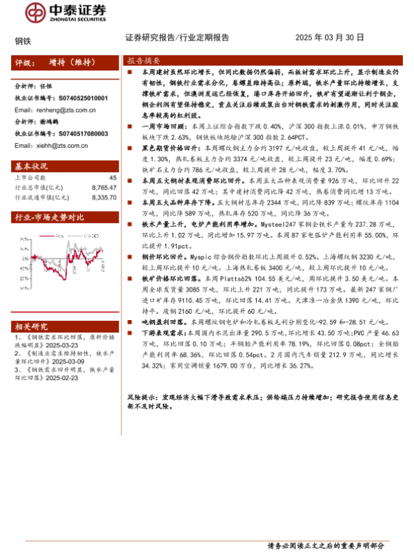 【中泰证券】【20250330】钢铁行业:制造业需求仍有韧性,铁水产量环比增长-16页 证券期货研究报告