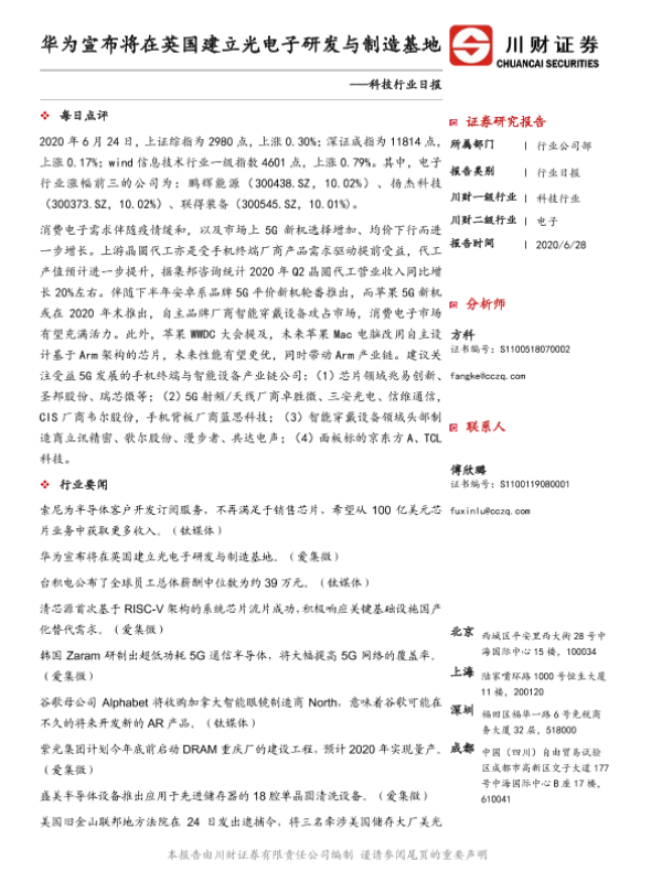 【川财证券】【20200628】科技行业日报:华为宣布将在英国建立光电子研发与制造基地-4页 证券期货研究报告