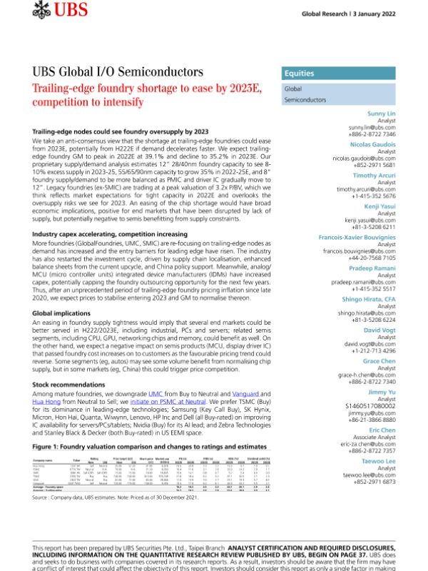 【瑞银(UBS)】【20220103】瑞银-全球半导体行业-到2023年,尖端铸造短缺缓解,竞争加剧-45页 行业研究