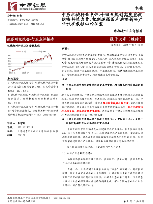 【中原证券】【20210316】机械行业点评报告:十四五规划高度重视战略科技力量,把制造强国和战略新兴产业放在最核心的位置-8页 行业研究