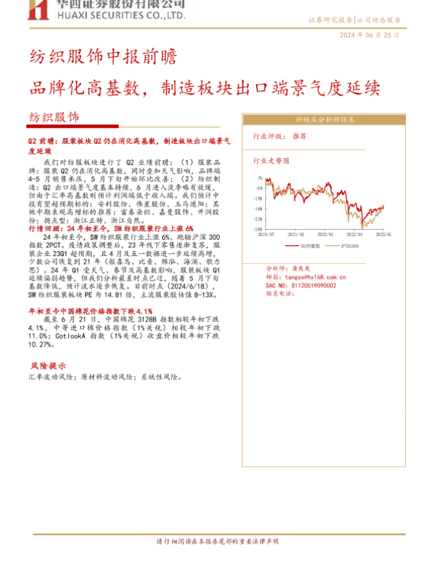 【华西证券】【20240625】20240625-华西证券-纺织服饰中报前瞻:品牌化高基数,制造板块出口端景气度延续-19页 行业研究