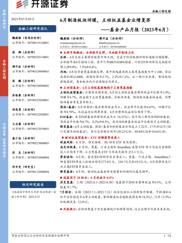 【开源证券】【20230705】基金产品月报(2023年6月):6月制造板块回暖,主动权益基金业绩复苏-24页 行业研究