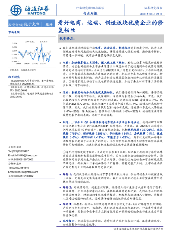 【海通证券】【20200621】20200621-海通证券-纺织与服装行业周报:看好电商、运动、制造板块优质企业的修复韧性-7页 行业研究