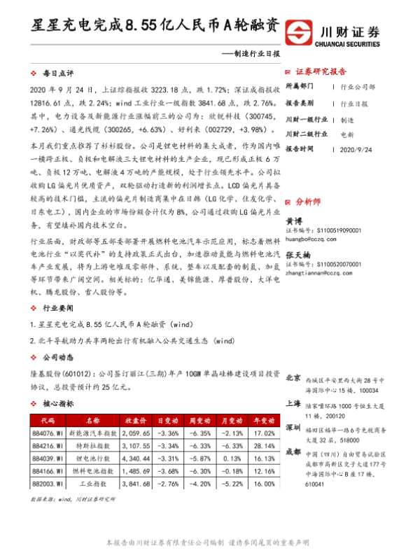 【川财证券】【20200924】制造行业日报:星星充电完成8.55亿人民币A轮融资-3页 证券期货研究报告