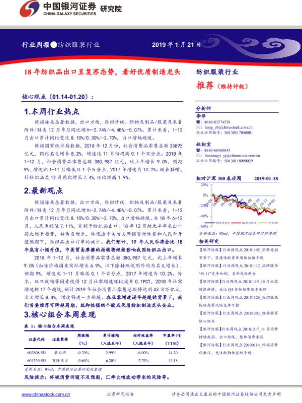 【银河证券】【20190121】20190121-中国银河-纺织服装行业周报:18年纺织品出口呈复苏态势,看好优质制造龙头-23页 行业研究