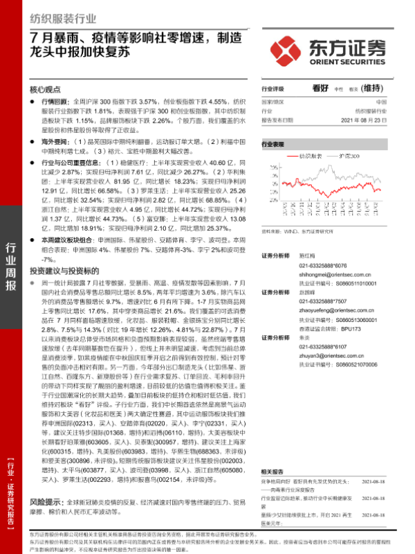 【东方证券】【20210823】纺织服装行业:7月暴雨、疫情等影响社零增速,制造龙头中报加快复苏-10页 行业研究