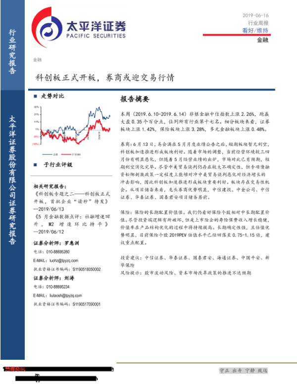 【太平洋证券】【20190616】金融行业周报:科创板正式开板,券商或迎交易行情-14页 行业研究