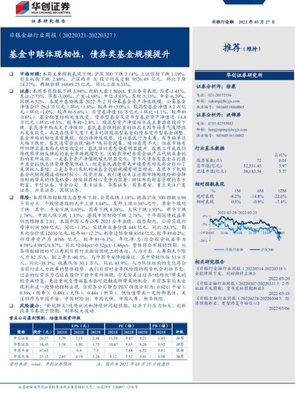 【华创证券】【20220327】非银金融行业周报:基金申赎体现韧性,债券类基金规模提升-16页 行业研究