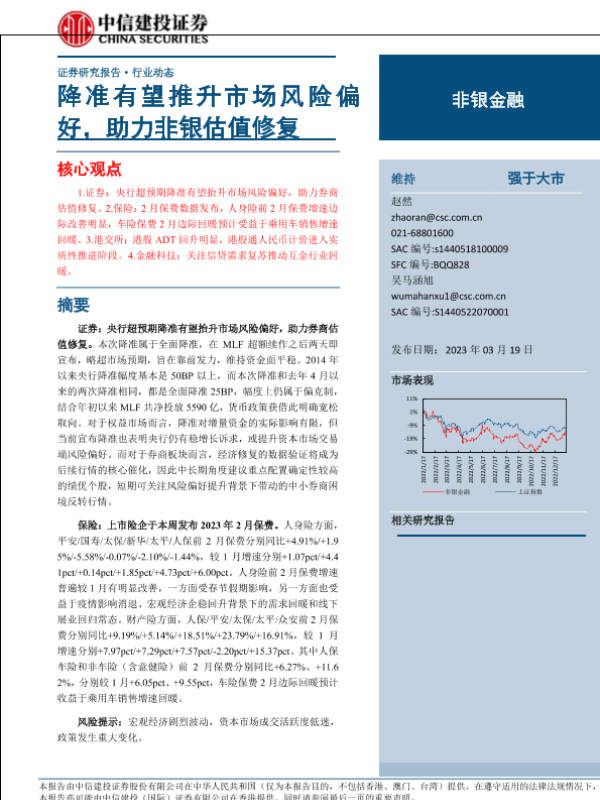 【中信建投证券】【20230319】非银金融行业:降准有望推升市场风险偏好,助力非银估值修复-22页 行业研究