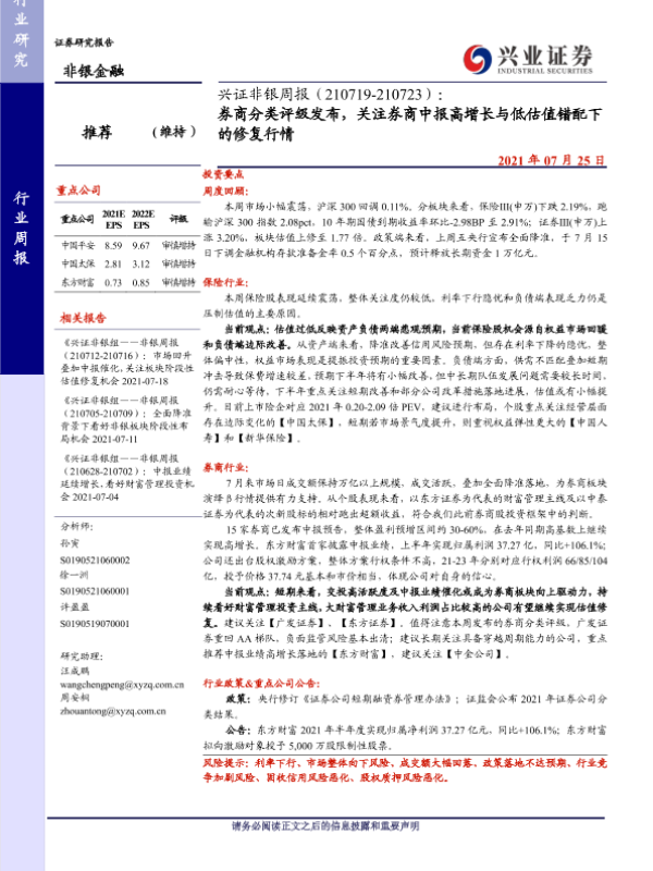 【兴业证券】【20210725】兴证非银周报:券商分类评级发布,关注券商中报高增长与低估值错配下的修复行情-18页 行业研究
