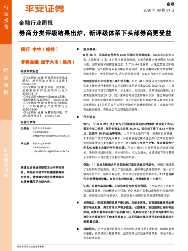 【平安证券】【20200831】金融行业周报:券商分类评级结果出炉,新评级体系下头部券商更受益-10页 行业研究