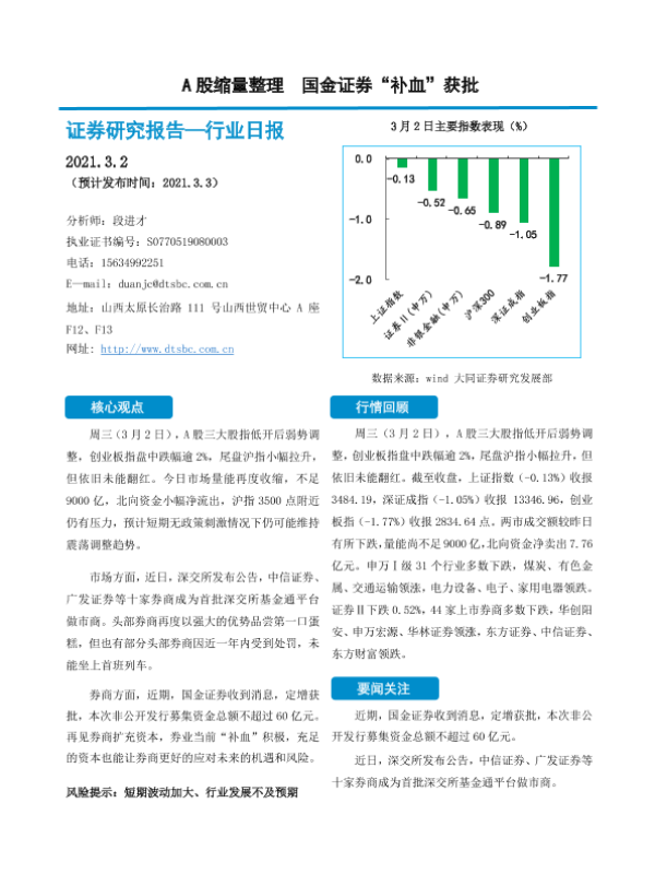 【大同证券】【20220302】非银金融行业日报:A股缩量整理,国金证券“补血”获批-11页 行业研究